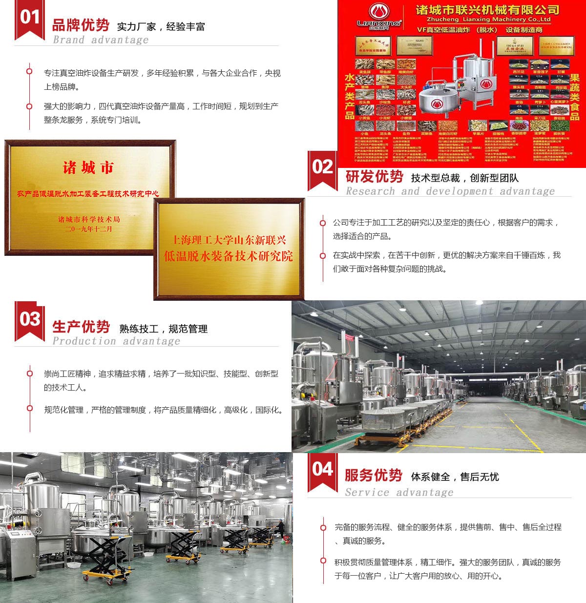 聯(lián)興第四代真空低溫油炸機(jī)顛覆了傳統(tǒng)意義上的真空油炸機(jī)工作時(shí)間長、工作效率低的概念。我公司通過大量客戶使用反饋,將設(shè)備進(jìn)行改造升級,同等型號同等設(shè)備較傳統(tǒng)意義上的真空油炸機(jī)工作效率提高了30%,且我公司每臺(tái)設(shè)備零部件均有存檔,方便為客戶提供便捷迅速的售后服務(wù)。